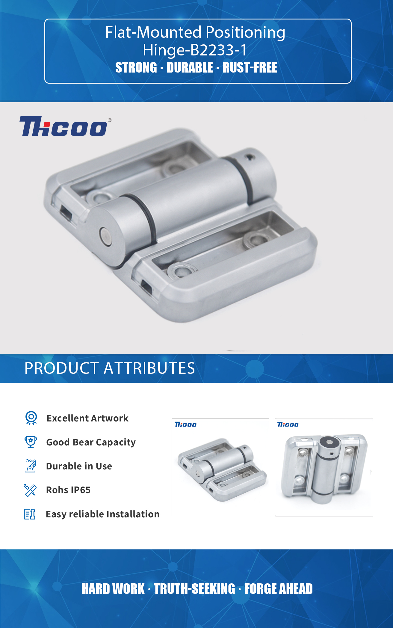 Temos nosso próprio laboratório de testes e equipamentos de inspeção avançados e completos, que podem garantir a qualidade dos produtos. Dobradiça de posicionamento de montagem plana-B2233-1  é um tipo de dobradiça projetada para manter uma porta, janela ou outro painel móvel em uma posição específica quando não estiver em uso. Essas dobradiças são normalmente montadas na superfície do painel, e não na borda.