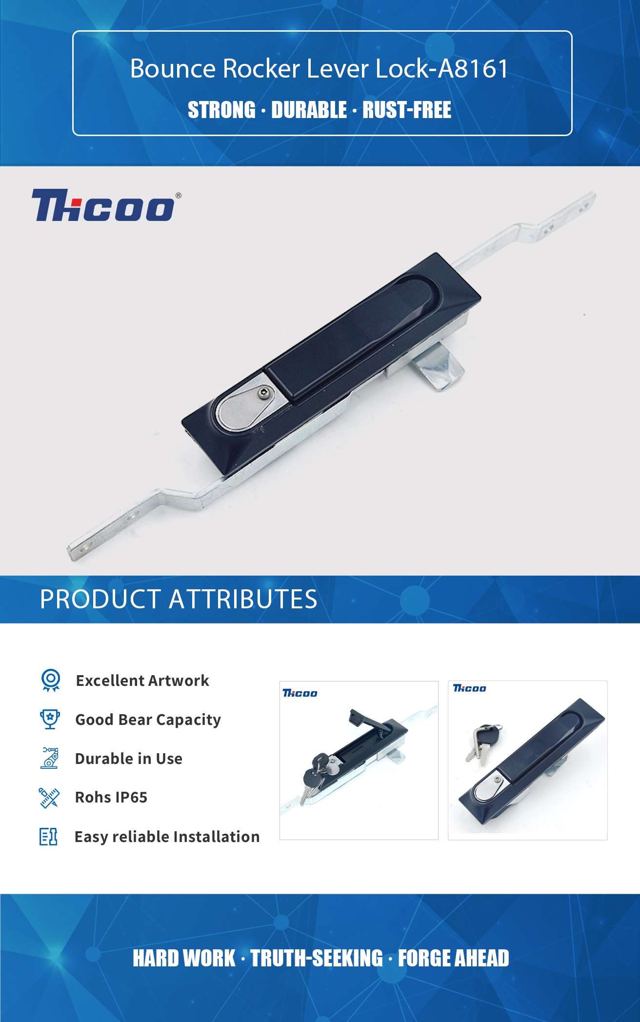 Temos nosso próprio laboratório de testes e equipamentos de inspeção avançados e completos, que podem garantir a qualidade dos produtos. Bounce Rocker Lever Lock-A8161 é um tipo de fechadura que usa um mecanismo de alavanca basculante e uma trava de mola para proteger uma porta ou outro dispositivo. A alavanca basculante é movida por uma chave ou outra ferramenta para destravar o mecanismo e permitir a abertura da porta. A trava de mola volta ao lugar quando a porta é fechada, ajudando a manter a porta travada com segurança.